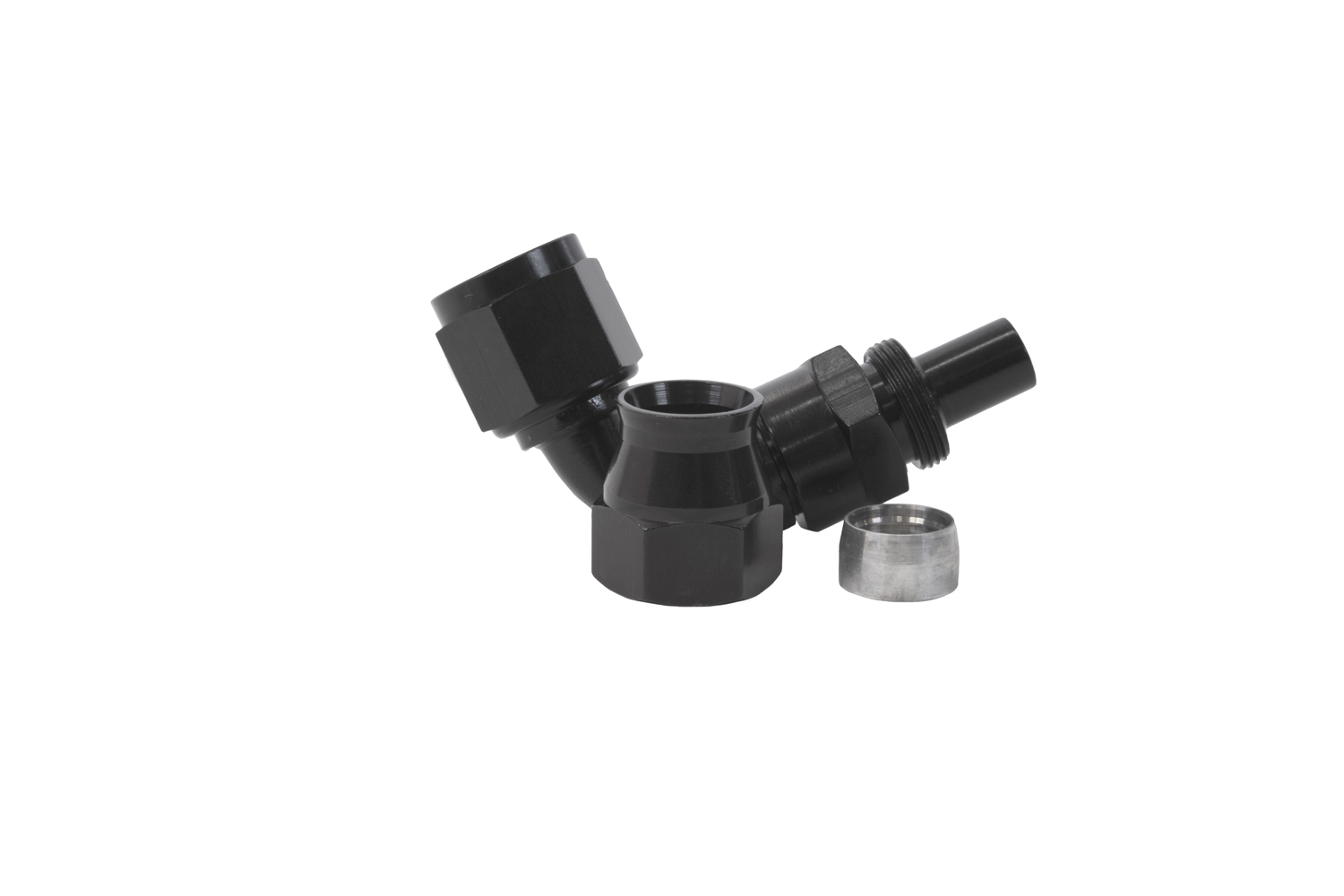 Fitting – Hose End – PTFE Racing Hose – 90 Degree – 8 AN Hose to 8 AN Female Swivel – Aluminum – Black Anodized – Each